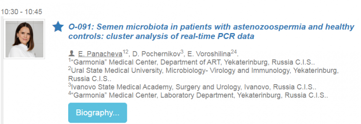 1. Устный доклад на тему “Микробиота эякулята у пациентов с астенозооспермией и здоровых мужчин: кластерный анализ данных, полученных методом ПЦР в реальном времени”. Подготовлен заведующей отделением лабораторной диагностики, д.м.н. Ворошилиной Екатериной Сергеевна и эмбриологом отделения ВРТ Паначевой Евгенией Александровной.