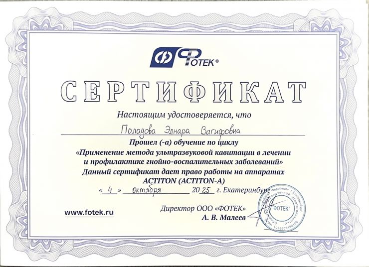 2022 год - повышение квалификации Уральский государственный медицинский университет, специальность "акушерство и гинекология"